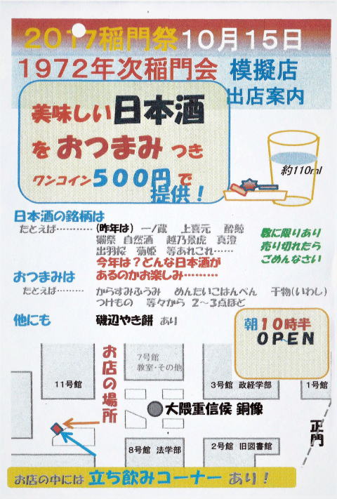 | 営業時間は10:30から売り切れ次第閉店となります、毎年好評で閉店は14:00頃になる可能性がありますので、お早めの来店がよろしいかと思います。店の場所は11号館(旧商学部の門が目印)の向かいにございます。皆さまの来店お待ちしてます。 昨年の営業風景がホームページにございますのでこちらもご覧ください。 ![]() |