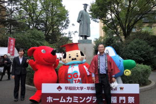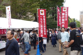 更に今年は幻の名酒が登場しました、寄贈頂いた山口さん、中村さんありがとうございました。 毎年日の当たる方角のテントが模擬店になり、せっかくの日本酒が午後になるとぬる燗になってしまう傾向にあります。来年以降はなにか工夫が必要かと思いました。 ![]() ![]() 今年の稲門祭は曇りのち晴れでした、ぬいぐるみ君にはこれでも暑かったかもしれません。 ![]() 記念撮影をしました、設営の皆さんご本当に苦労様でした。 ![]() (72年 教育学部 英文科卒 笠井敏晴) |