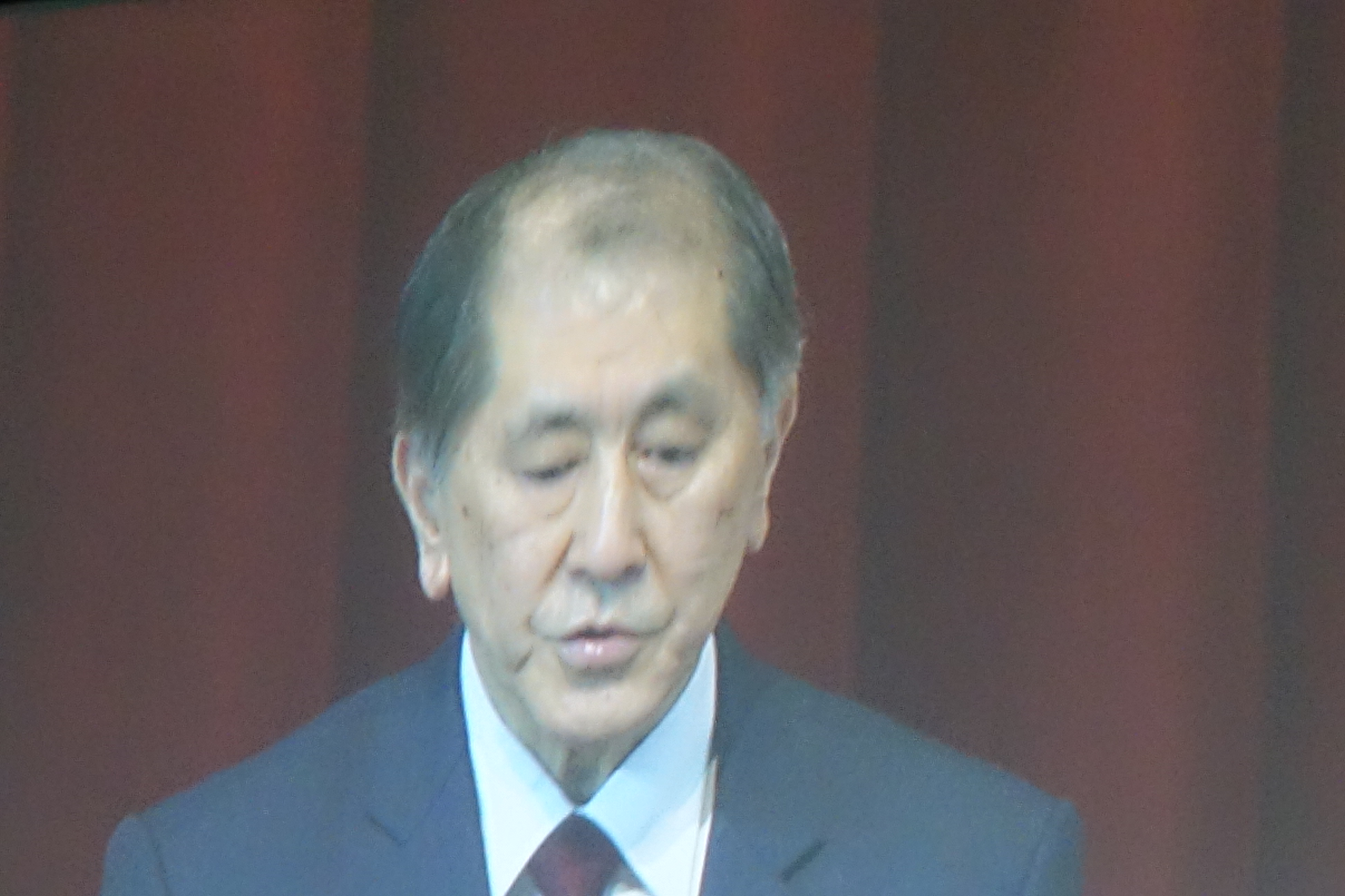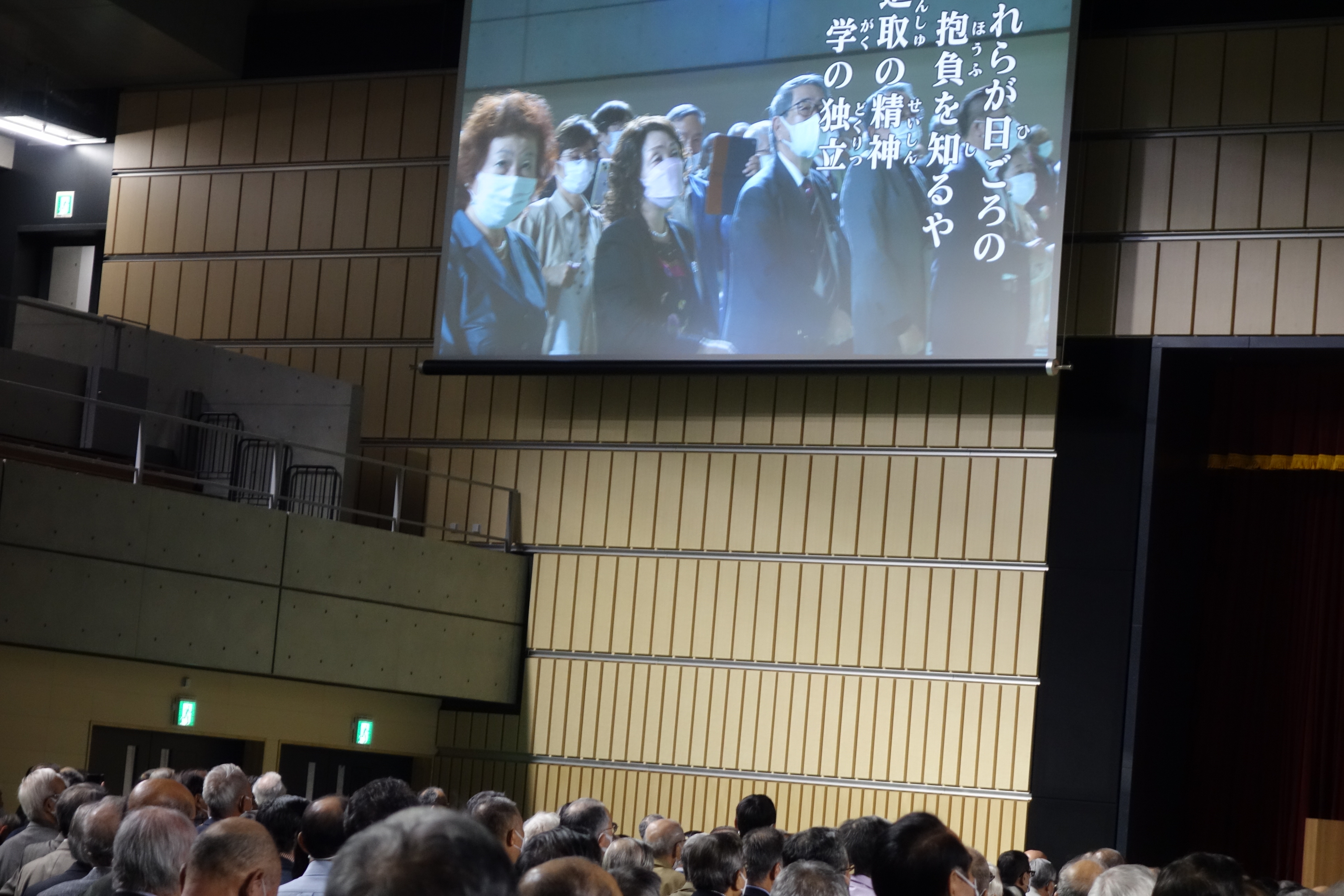 校友会代表幹事、萬代晃氏挨拶の後に 校歌の演奏が始まりました。 |