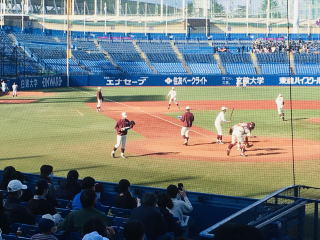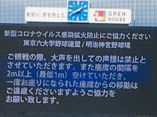 階下の売り場に行ってみましたが寂しい限りの風景でした。![]() 試合前早稲田のノック風景です。 ![]() 今週からは応援部の外野席応援が許可になり、ライトからは都の西北が、レフト側からは立教大学の校歌が聞えてきました。 ![]() 試合は早川(木更津総合)の力投で何とか立教大学に勝利し早慶戦に望みを繋ぐ事ができましたが打撃陣が心配です。 晴天微風の神宮において、NHKの朝ドラ「エール」で紹介された応援歌、古関 裕而氏作曲の紺碧の空を聴き気分転換、来週からも何とか頑張れそうな気がしてきました。 (教育学部卒 流山市在住 笠井敏晴) |