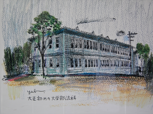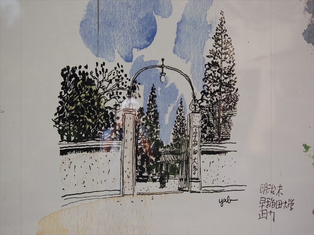 | 藪野健先生(早稲田大学栄誉フェロー、名誉教授、日本藝術院会員)が描かれた絵が大好評につき、明治・大正編を作成しパートⅡとしてホームページに掲載いたしました。今回はリアルな感じを生かすため、商学部新校舎工事の為設置された壁面の絵を使用しましました。なお今回も前回と同様に藪野先生からご了解をいただき掲載いたしました、ありがとうございました。 |